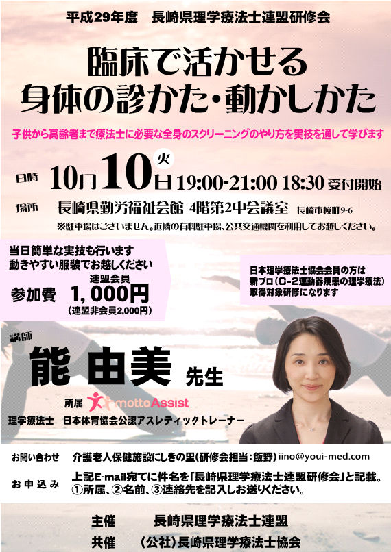 2017年9月28日 / 最終更新日時 : 2017年10月4日 事務局 広報部 長崎県理学療法士連盟研修会 カレンダー カレンダーに追加 Timely カレンダーに追加 Google に追加 Outlook に追加 Apple カレンダーに追加 他のカレンダーに追加 XML ファイルとしてエクスポート 日時: 2017年10月10日 @ 7:30 PM – 9:00 PM 2017-10-10T19:30:00+09:00 2017-10-10T21:00:00+09:00 場所: 長崎リハビリテーション病院 より多くの方に参加いただけるように、参加費が無料となりました! ※新プロ取得希望者は、1000円徴収させていただきます。 関連